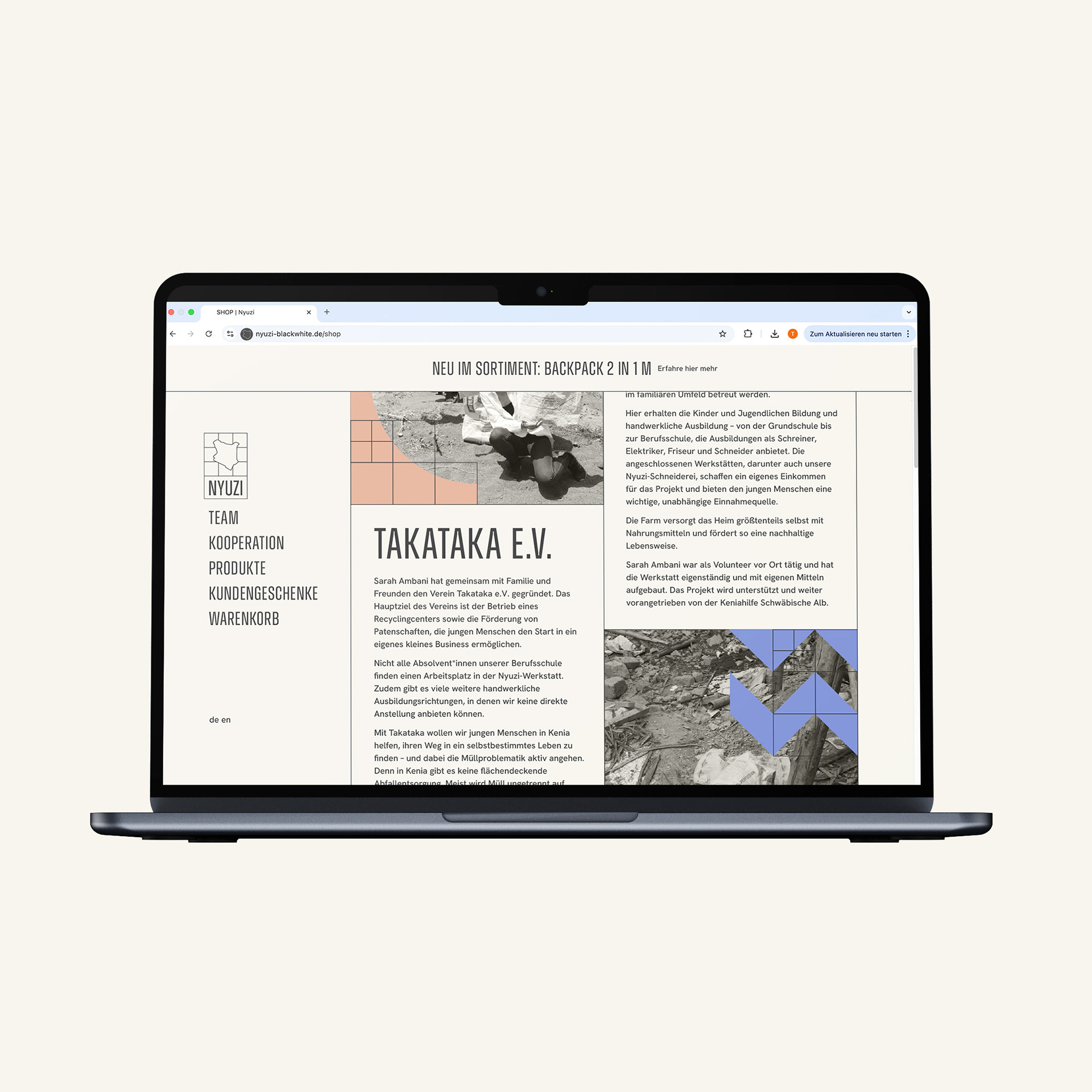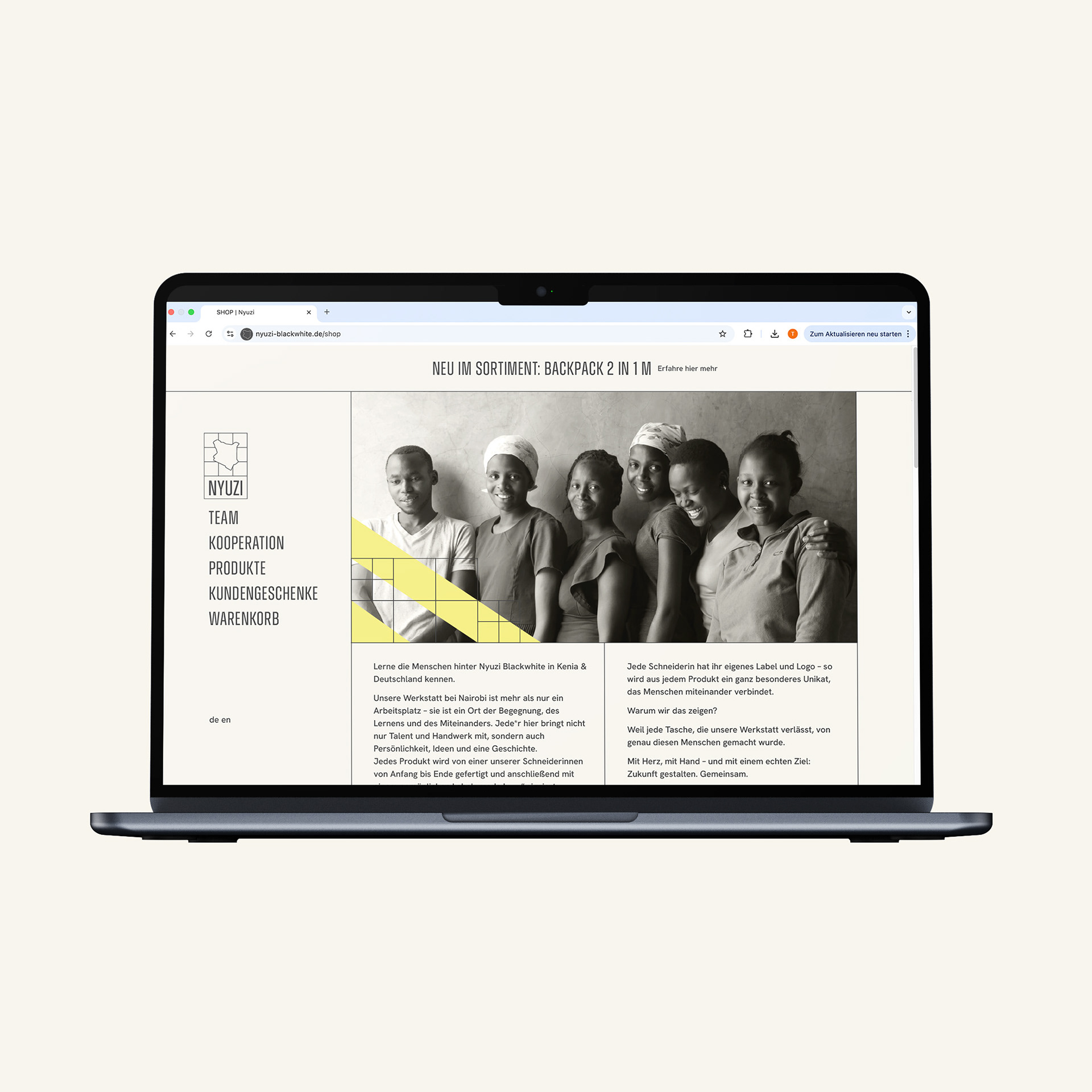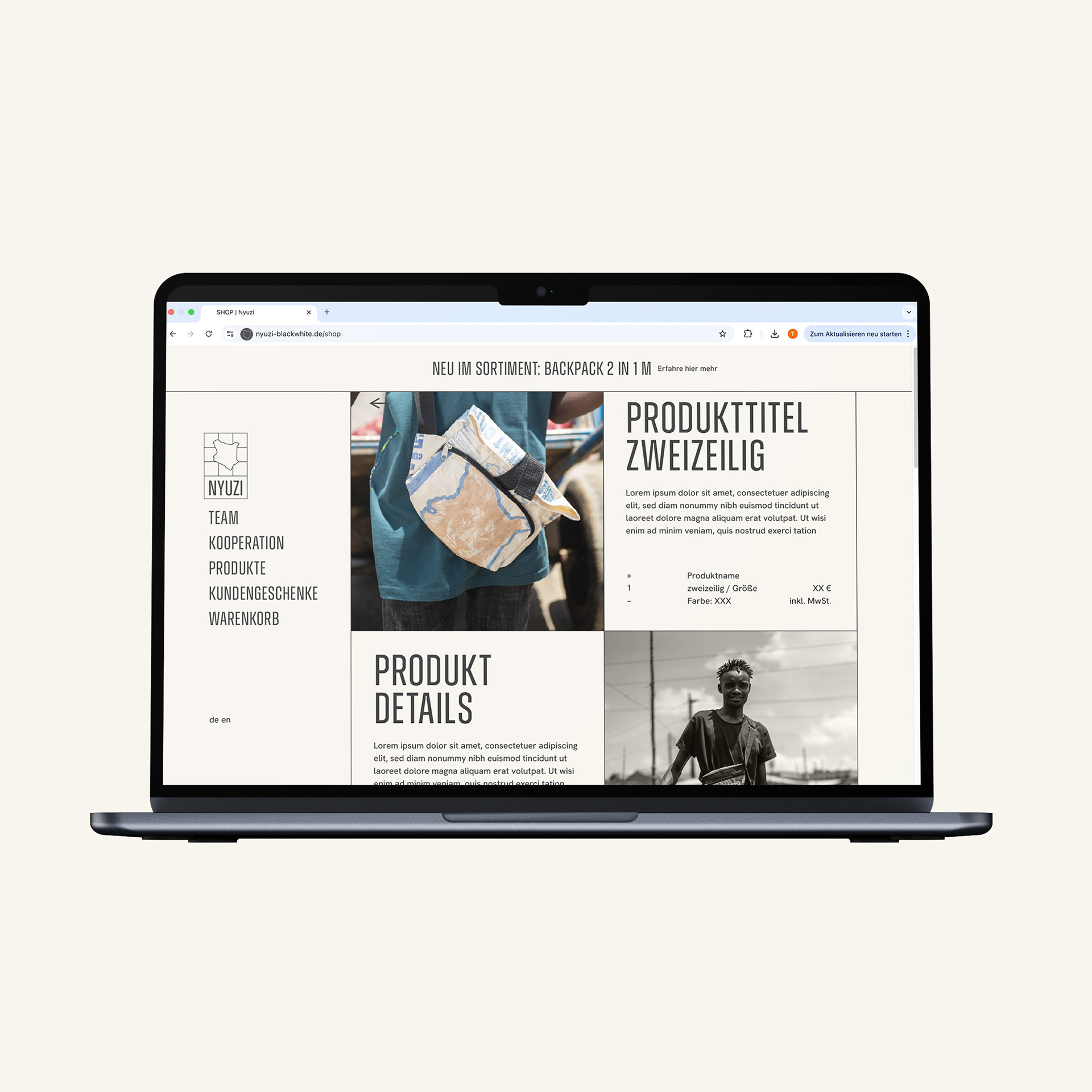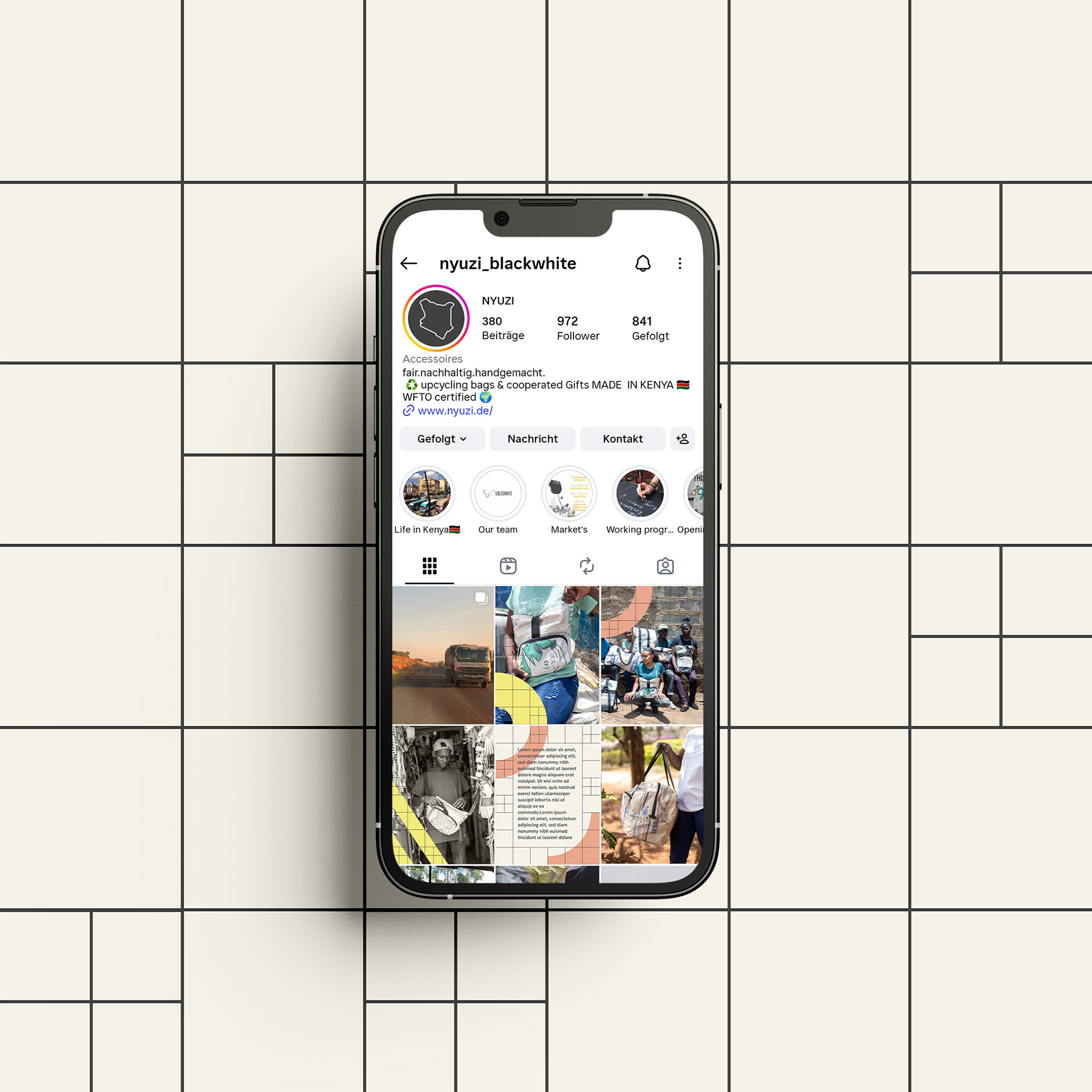 Das Label Nyuzi steht für faires Upcycling. In einem sozialen Projekt in Kenia verwandelt die Marke alte Zementsäcke in ultraleichte und robuste Produkte – aus Abfall werden hochwertige Unikate. Dabei entstehen faire Arbeitsplätze vor Ort – eine Hilfe zur Selbsthilfe: Junge Menschen in Kenia befassen sich so mit dem Thema Abfallproblematik und lernen Lösungsansätze durch Upcycling kennen.