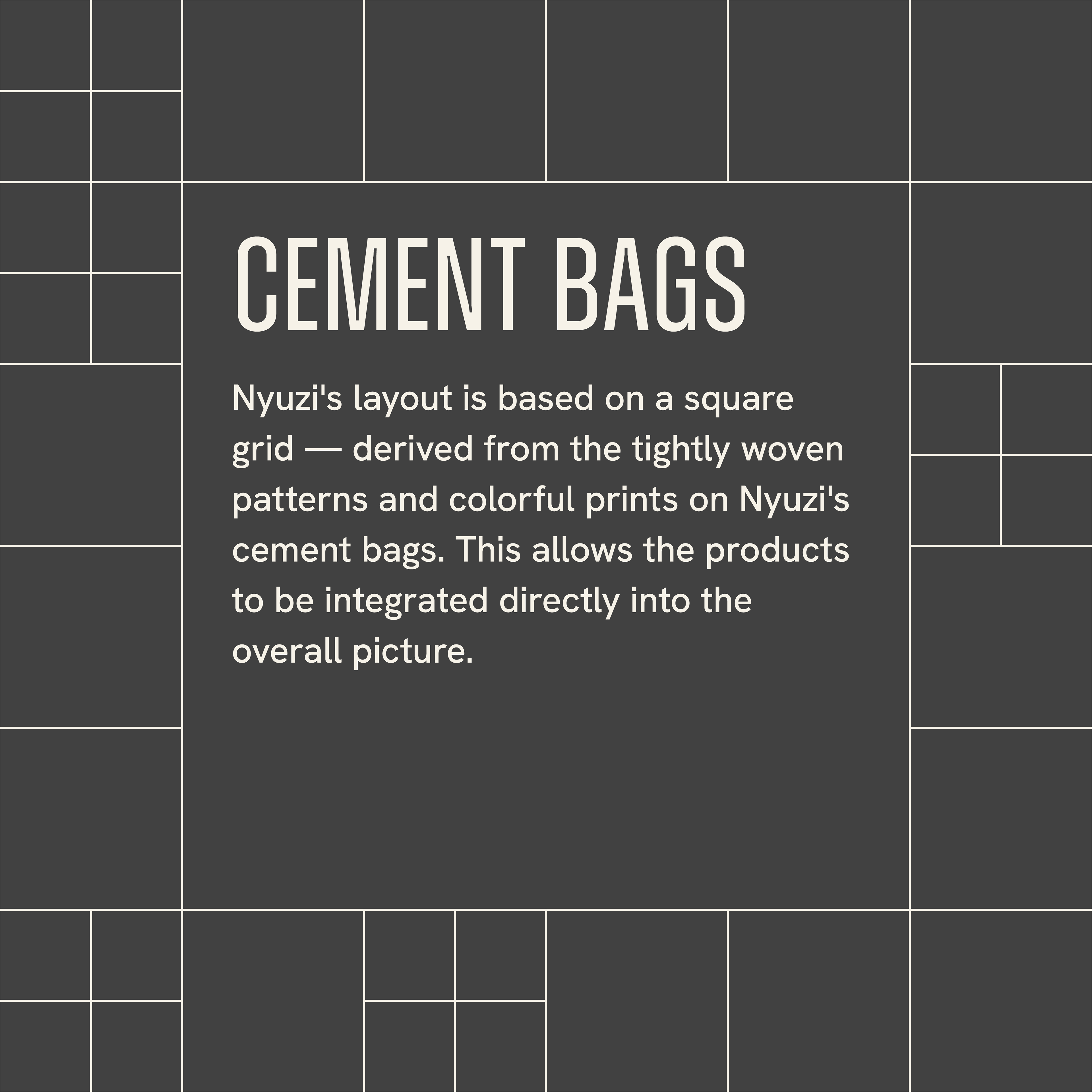 Ergebnis ist eine Gestaltung, die sich stark von der Konkurrenz abhebt. Grafische Klarheit trifft auf einen Farbeinsatz, der Produkten und Bildern nicht die Schau stiehlt. Das zentrale Keyvisual ist ein abstrahiertes Muster, abgeleitet von den engmaschigen Rastern und farbenfrohen Bedruckungen der Zementsäcke. Dadurch werden die Produkte direkt in das Erscheinungsbild eingebunden.